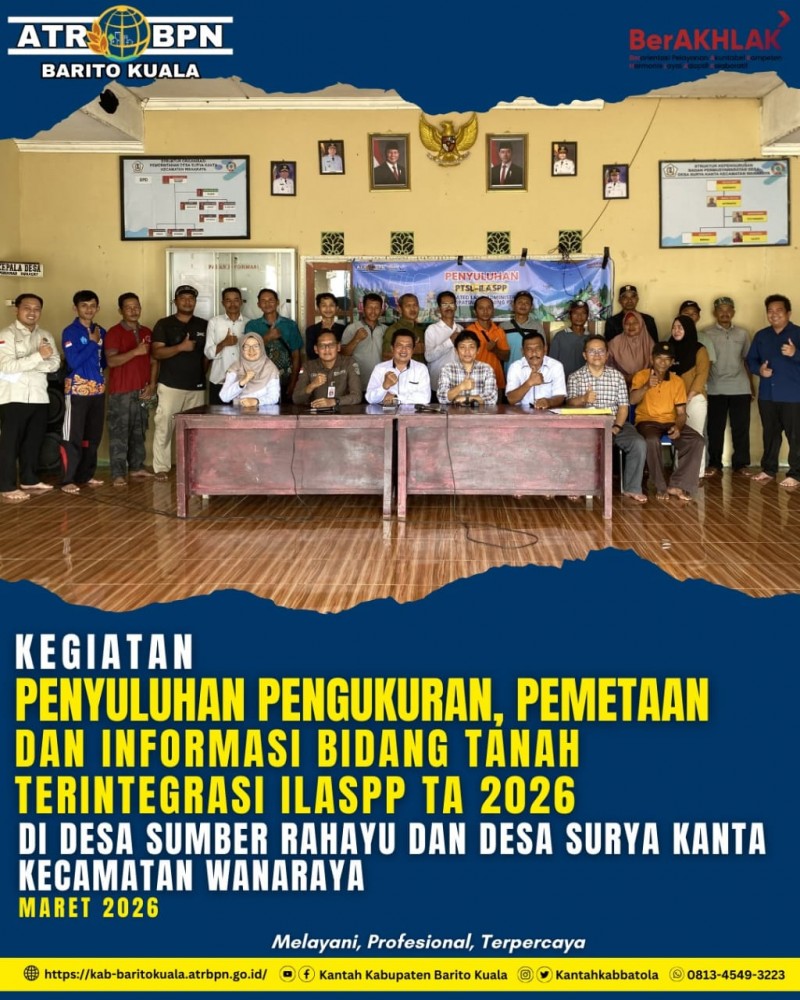 Kantor Pertanahan Kabupaten Barito Kuala Melakukan penyuluhan dalam rangka pelaksanaan kegiatan pengukuran, pemetaan dan informasi bidang tanah terintegrasi pada ILASPP Ta 2026.